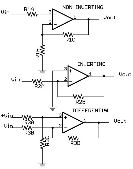 One is an inverting amplifier, one is a non-inverting amplifier, and the third is a differential amplifier,